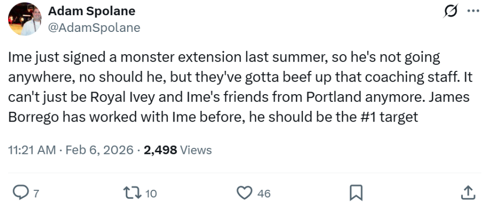 赛后火箭记者Adam Spolane对此点评道:“乌度卡去年才与火箭签下巨额长约,所以他哪也不会去,但他必须补强助教团队,不能只是靠艾维和乌度卡从波特兰带来的那帮朋友了,博雷戈曾与乌度卡共事过,他应该是头号目标人选。”